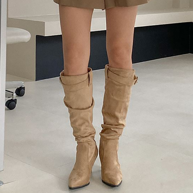 [굽8cm/225~250] 통굽 롱부츠 스틸레토 스웨이드 버클 스트랩 키높이 누니-신발
