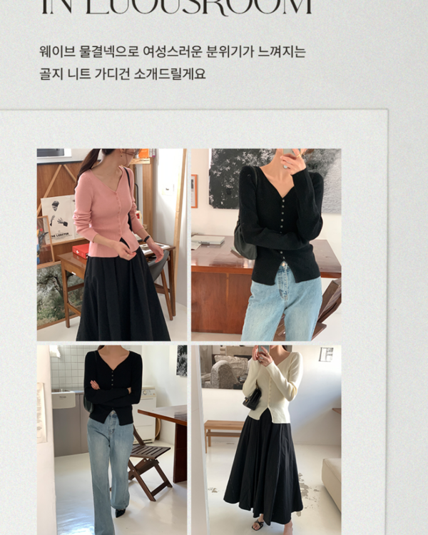다비나 웨이브 물결 하트넥 여리 슬림핏 비스코스 골지 단추 버튼 니트 가디건