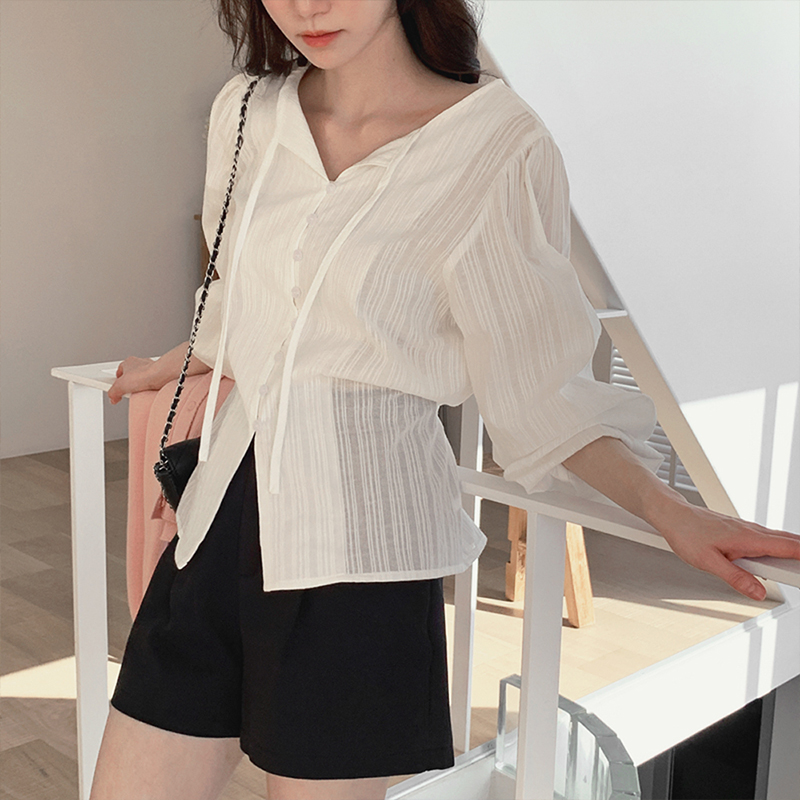 [제작] [2만장/2사이즈] #MADE [tbs0447] 트리안 리본 버튼 라운드 블라우스(긴팔블라우스,리본블라우스,반팔블라우스,하객룩,가을블라우스,스트랩블라우스)