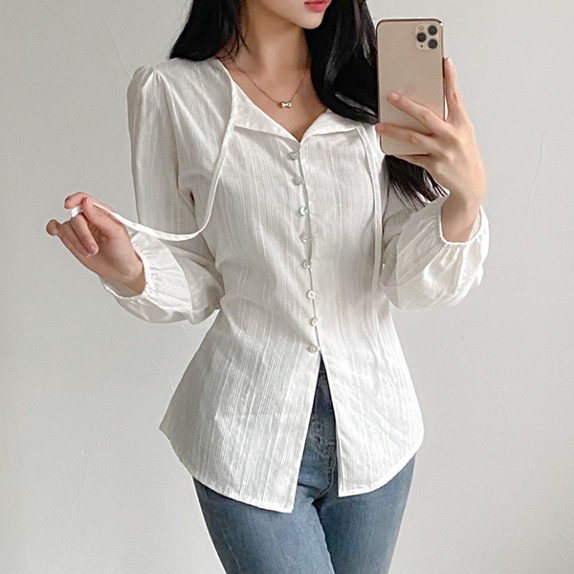 [아이보리/블랙당일출고] 케이트롱BL(3c) 긴끈블라우스 롱블라우스 자개단추 퍼프 긴팔블라우스 가을신상 데이트룩 하객룩 출근룩