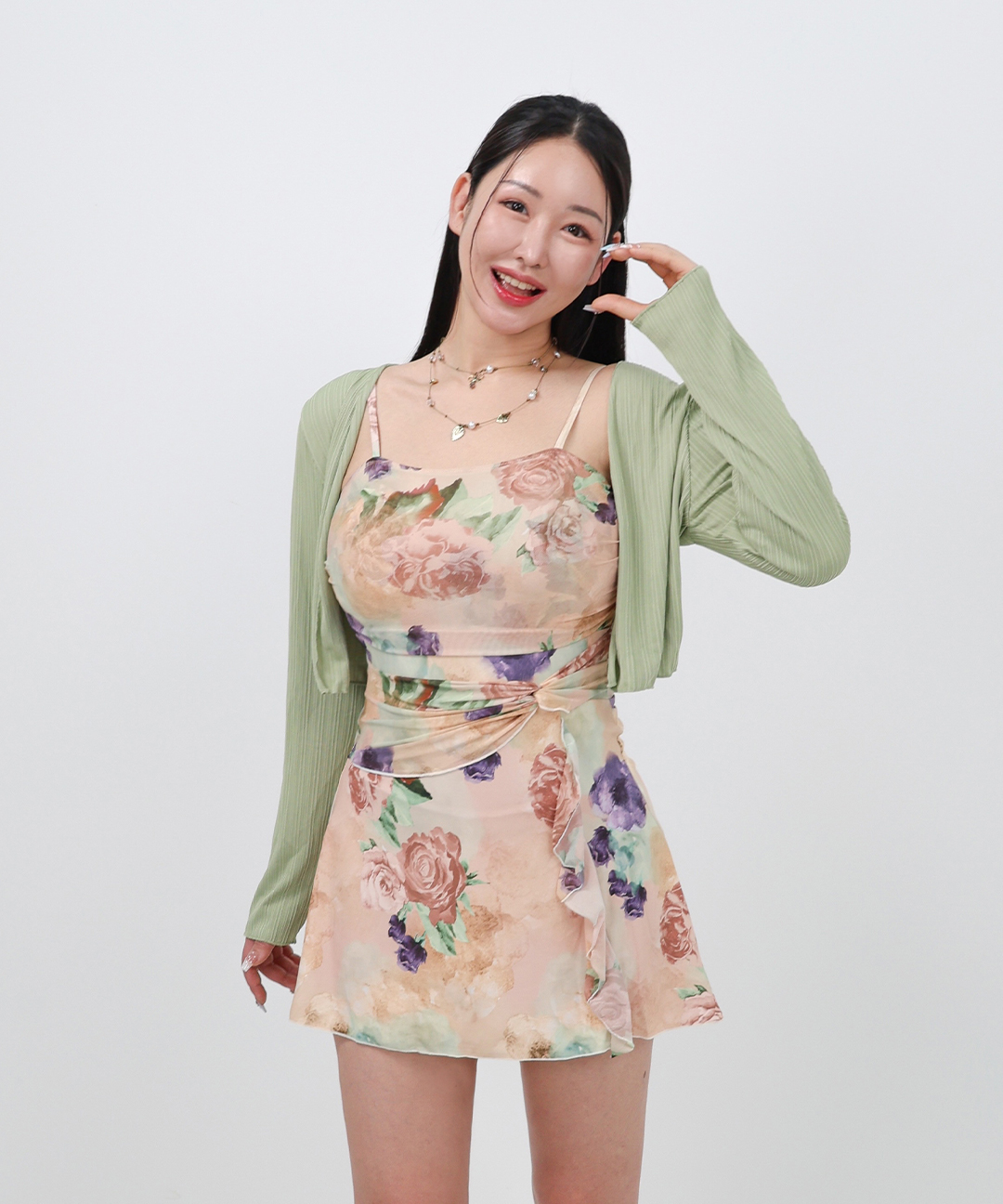 [L-4XL/빅사이즈] 스위티 원피스 수영복 체형커버 플라워 긴팔 셔링 래쉬가드 + 커버업 2피스 세트