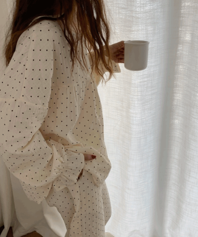봄신상 인기상승 긴팔 러블리 라운드도트 우정 커플 파자마 원피스 상하세트 홈웨어 (3304)