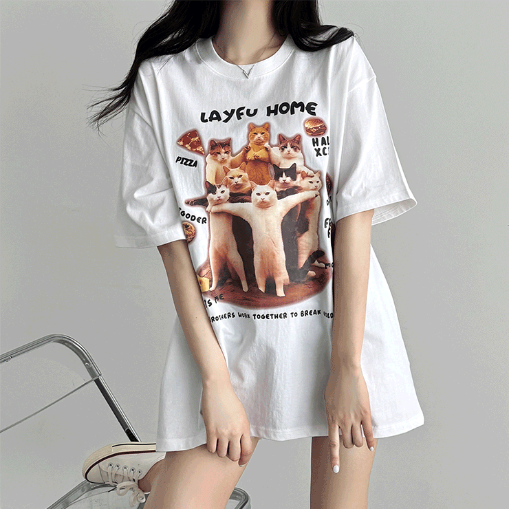 [면100/남여공용] 에잇 캣 프린팅 반팔 티셔츠 오버핏 순면 빅사이즈 반팔티 반소매 박스티 커플티 고양이 no.2006