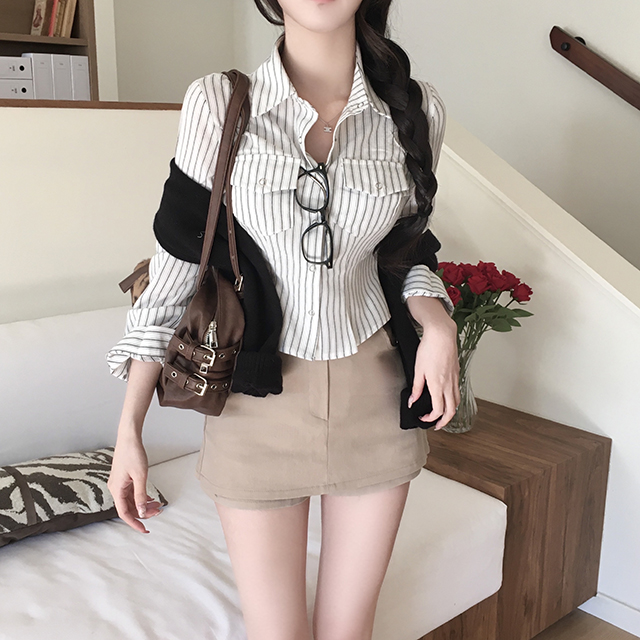 [ 허리라인 ] 퓨즈 스트라이프 크롭 핀턱 셔츠