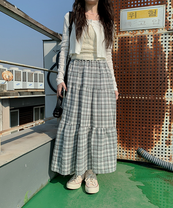 [3컬러] 토핑 체크 캉캉 사선 롱 스커트 안감 레이어드 빈티지 플레어 A라인 치마