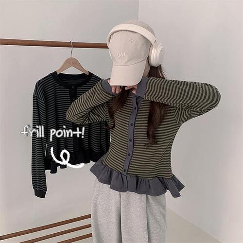 [레이어드/데일리] 튜러 루즈핏 스트라이프 단가라 프릴 배색 가디건 (2color)