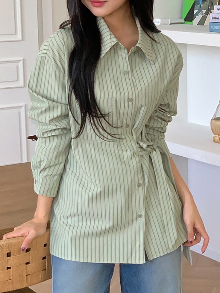 [4천장 돌파✨][무료배송][포인트룩/여리핏][반팔/긴팔] [44-120] 드레트니 스트라이프 리본 스트랩 셔츠( 봄-여름-데일리룩-데이트룩-빅사이즈-120사이즈-자체제작-리본셔츠-포인트-코튼 )