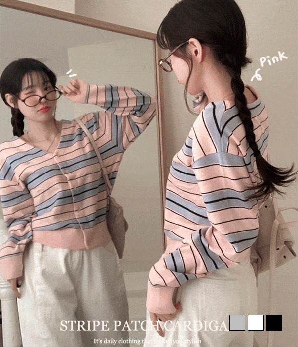 [무료배송] 쿠크 브이넥 배색 스트라이프 패치 가디건