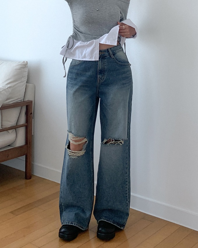 [ XS-XL ] 제바 무릎찢청 데미지 와이드 데님 팬츠