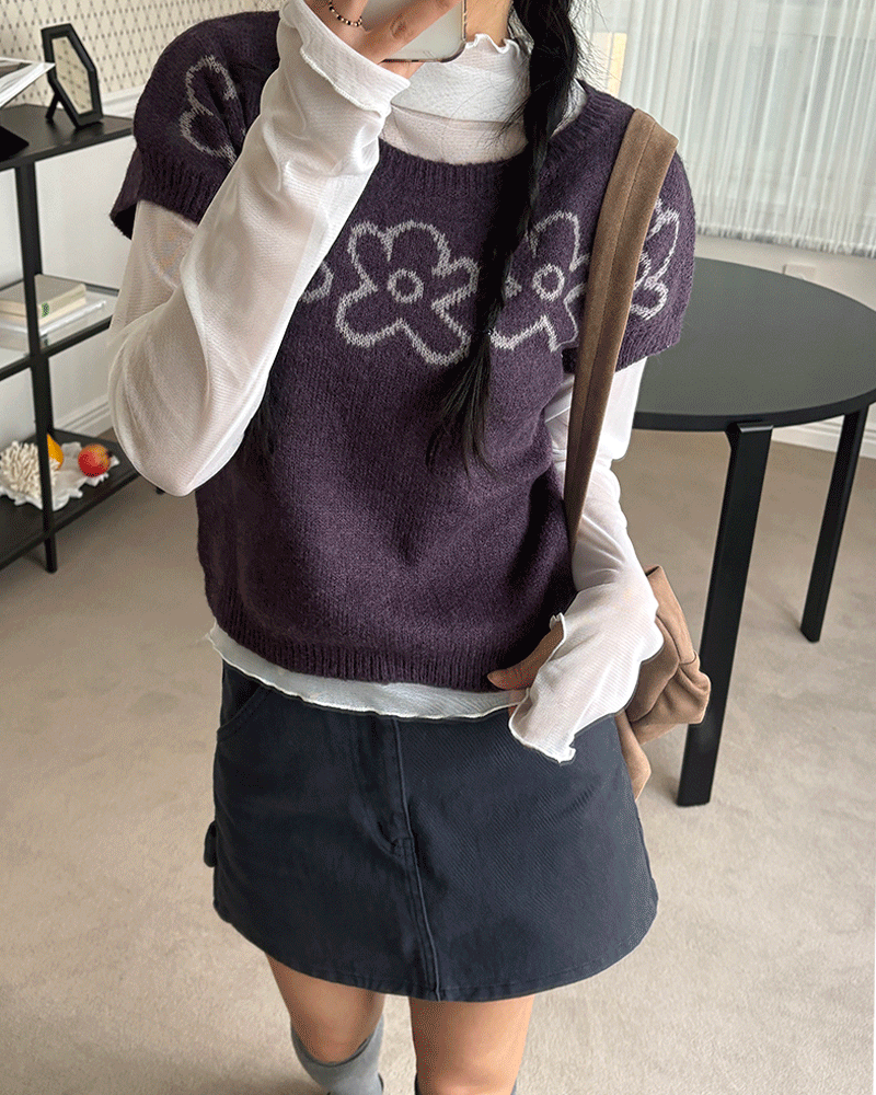 [울혼방]프틸 라운드 플라워 크롭 반팔 니트(퍼플,그레이)