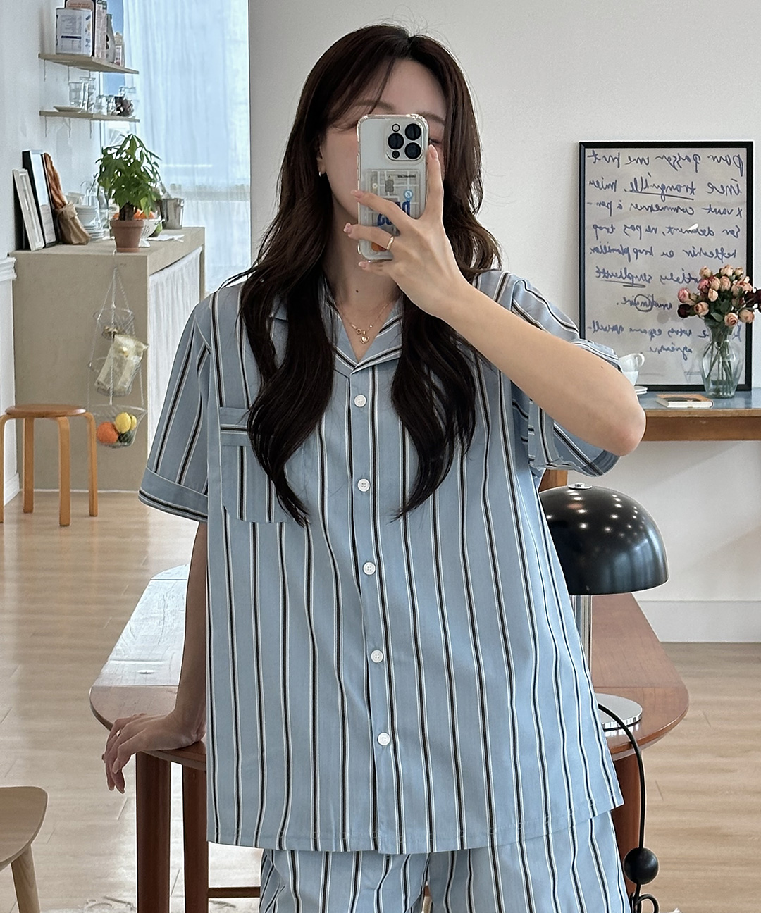 모카 베일 코튼블렌드 반팔 카라 잠옷 세트