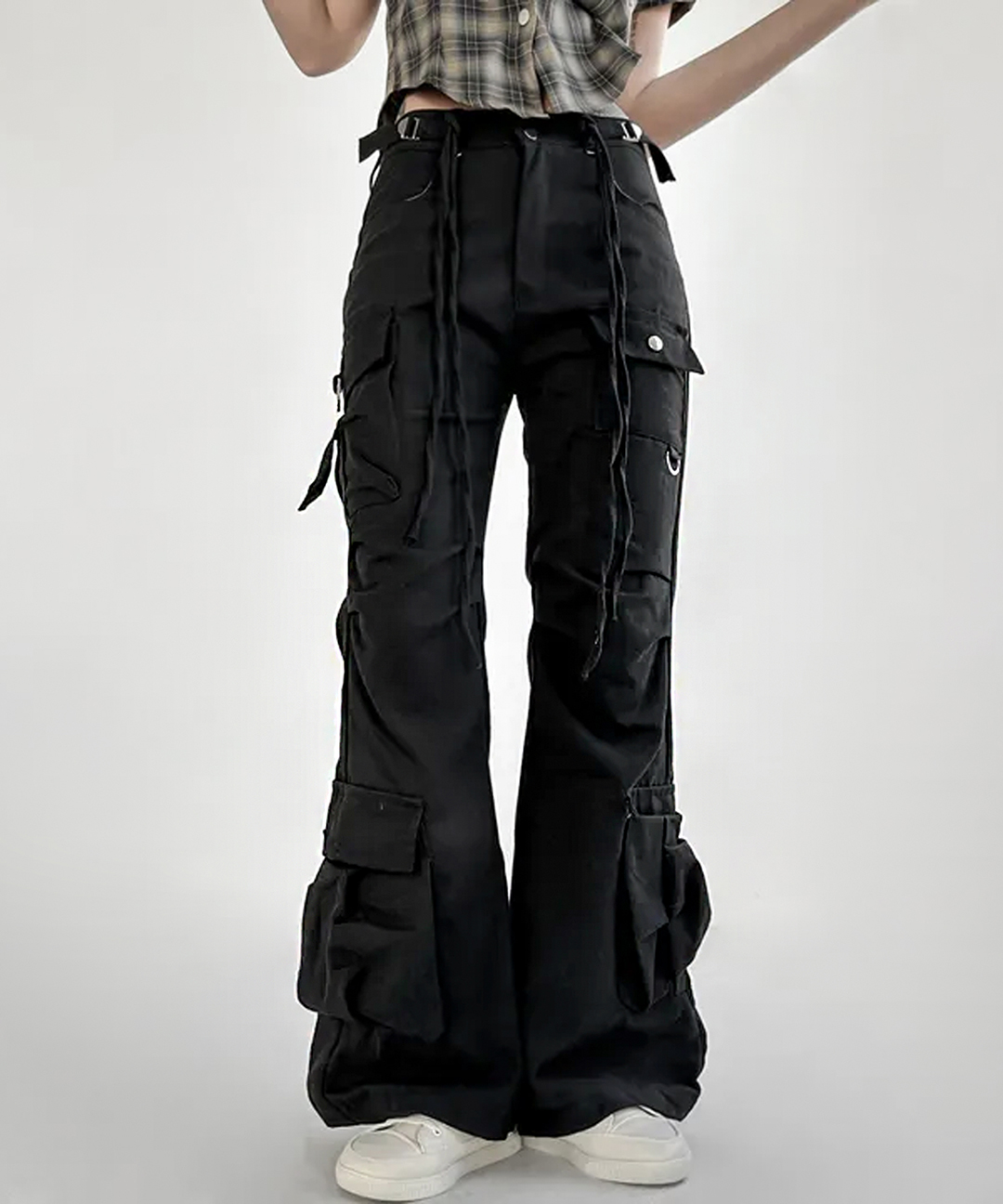 당일출고🚀[가을🍂/unique] 버클 스트링 셔링 카고 포켓 루즈핏 부츠컷 블랙 면팬츠