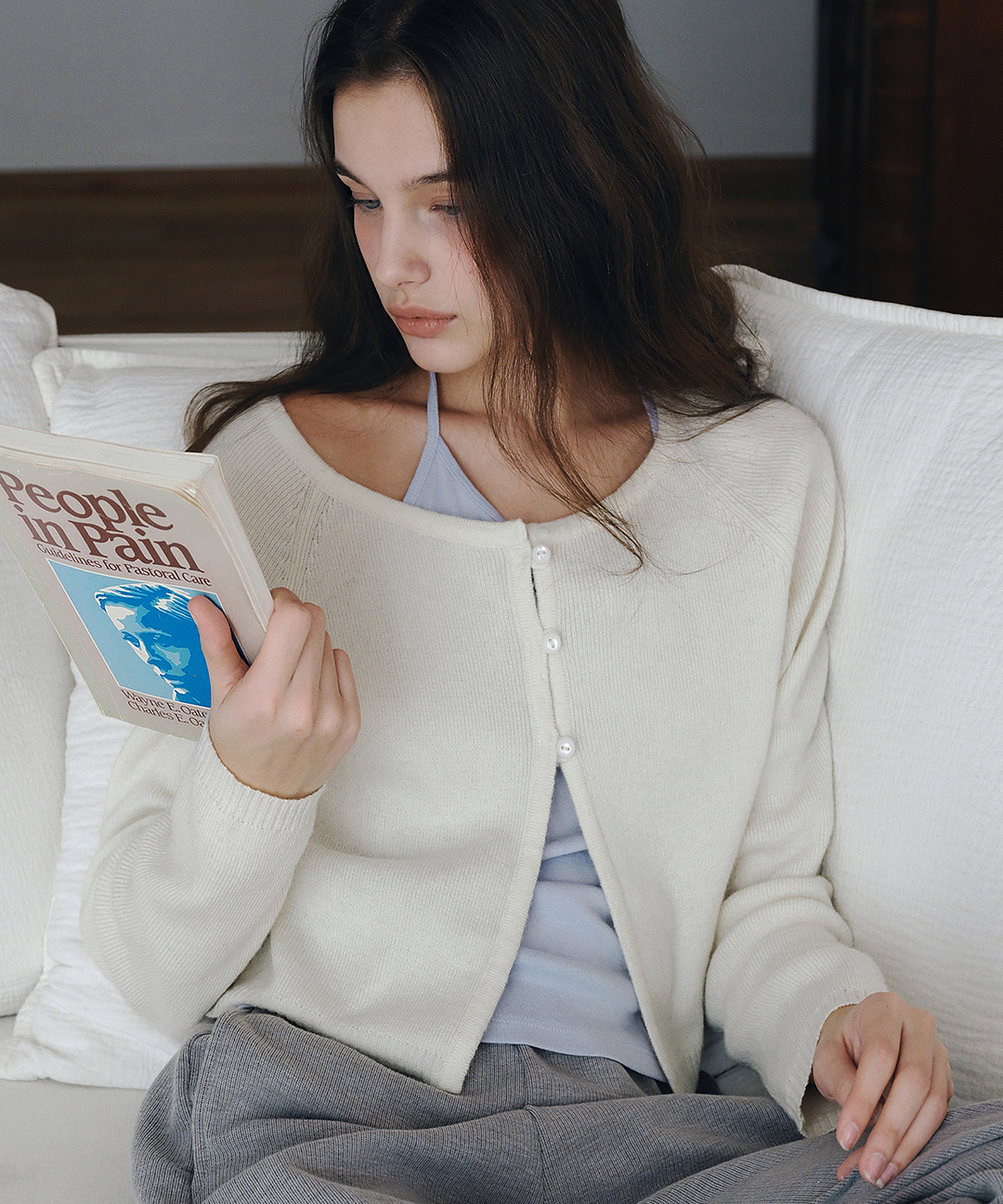보트넥 크롭 니트 가디건 - 아이보리