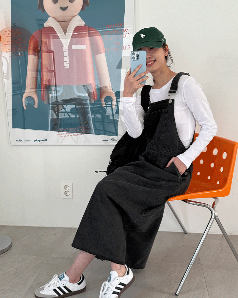 [55~110]봄/데일리룩/데이트룩/페미닌룩/빅사이즈/110사이즈/자체제작/탄탄한/레이어드/깔끔한/하체커버/단추 뎁스흑청오버롤원피스