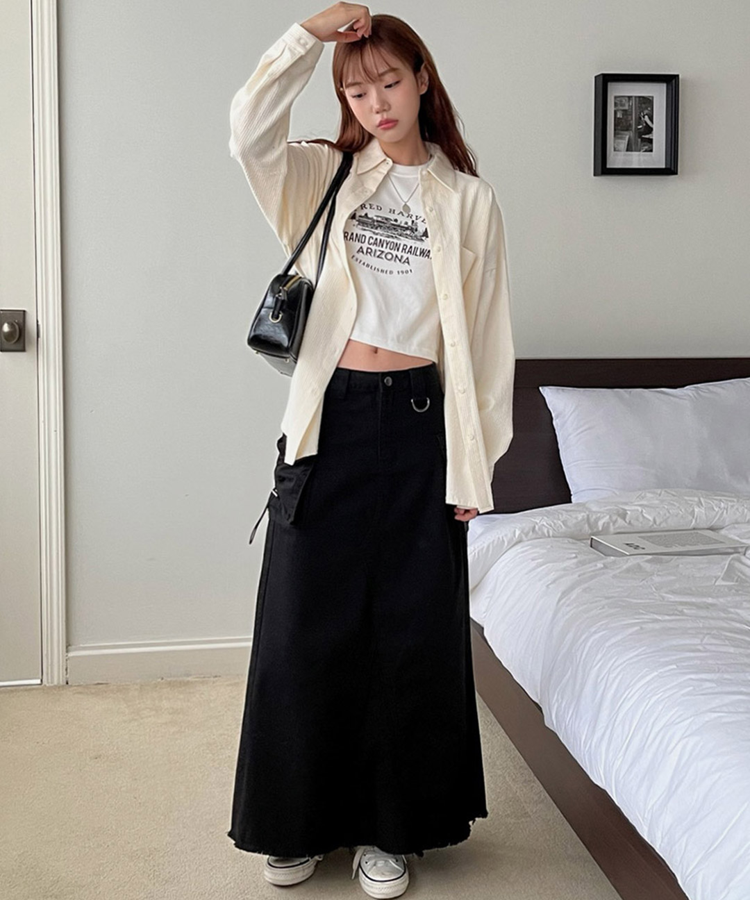 [🌱봄재진행 990원 특가 상품] 스토퍼 포켓 절개 코튼 스커트 2color [봄/캐주얼/카고/핏보정/데일리룩/개강룩/롱/트임/빈티지/롱치마]