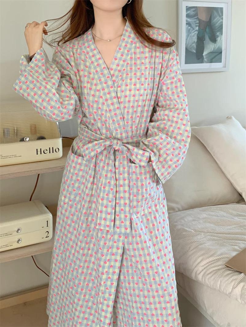 (핑크하트로브잠옷) 빅사이즈잠옷 여성가운 편한 면 가을 긴팔 샤워 파자마 원피스