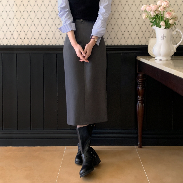 [MOMENT JOY/국내제작/벨트SET] 아네스 슬림 클래식 H라인 절개 뒷트임 데일리 하객룩 롱 스커트