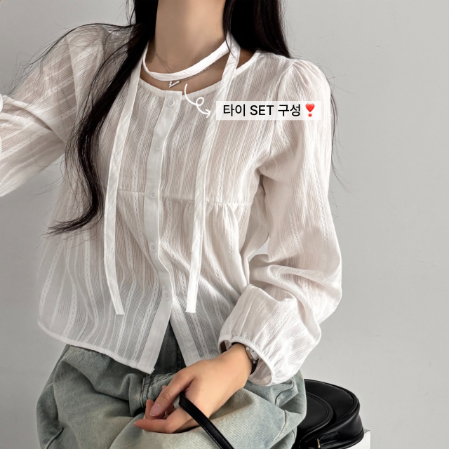 러블리🤍/타이SET] 페미닌, 레이스 퍼프 셔링 펀칭 긴팔 블라우스 - 2color