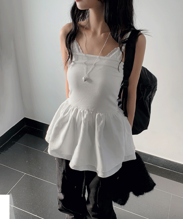 [2컬러] 뽀얀 실키 플레어 레이어드 끈 나시 스퀘어 캉캉 골지 밑단 쉬폰 스판 민소매