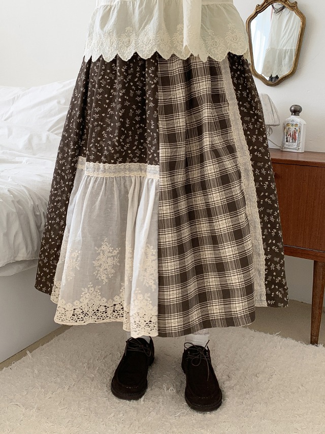 빅사이즈 S-2XL 챠멀 빈티지 플라워 체크 레이스 패치워크 레이어드 밴딩 롱 스커트