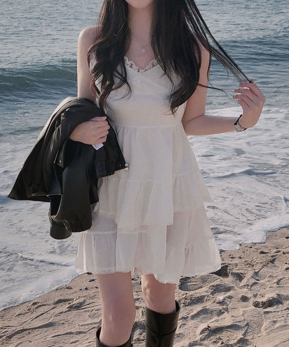 [미디기장감!/끈조절O/new신상✨]스완 레이스 플레어 코튼 캉캉 언발 미디 원피스
