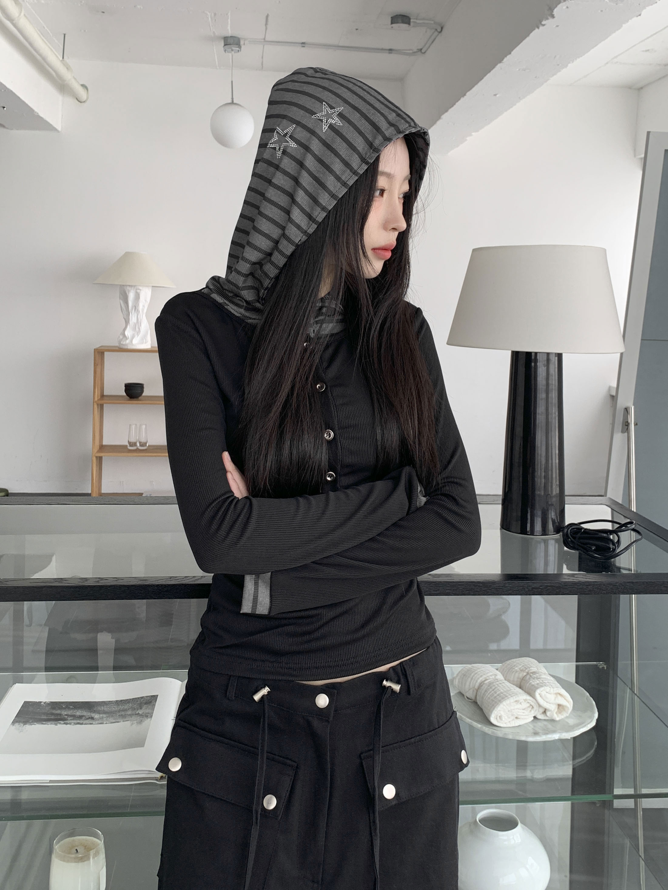 [y2k/레이어드템] 별 단가라 레이어드 슬림 후드 티셔츠