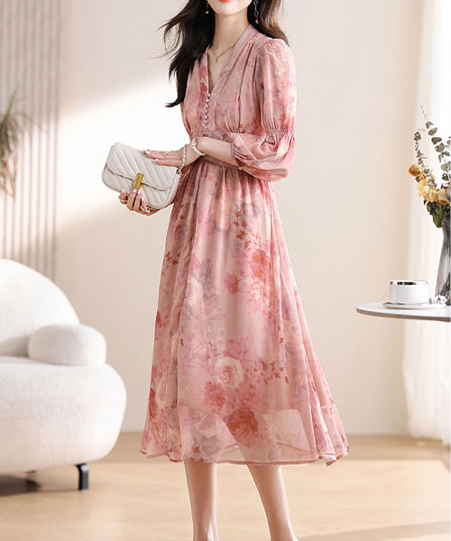 [투피앤] 로아타 브이넥 긴팔 벌룬 소매 플라워 롱 원피스