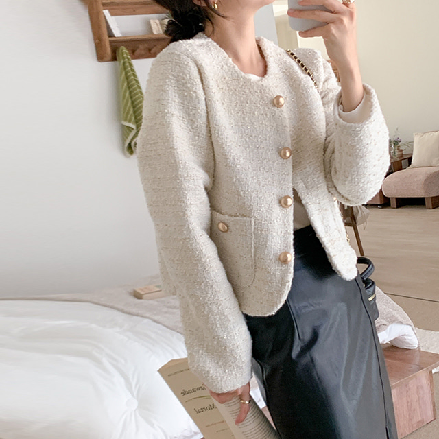 설레임 골드 버튼 노카라 크롭 트위드 자켓 여성 간절기 자켓 하객룩