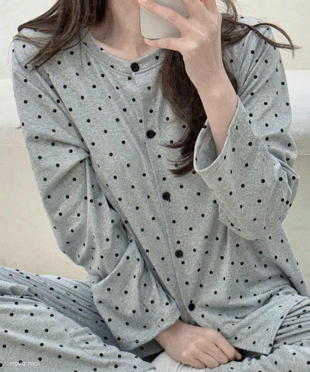 도트 멜로우 라운드넥 잠옷 봄 투피스 면 파자마 세트 데일리 가을 모던 홈웨어