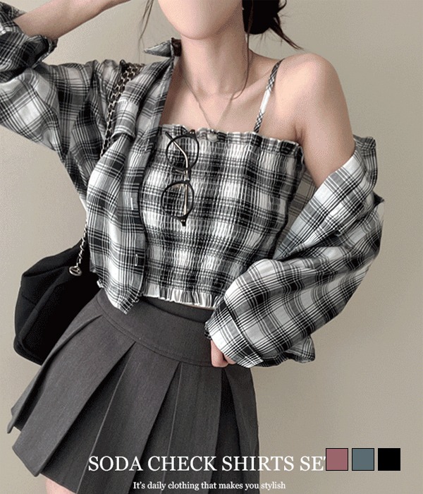 [무료배송] 소다 체크 나시 + 스트링 크롭 셔츠 투피스 세트