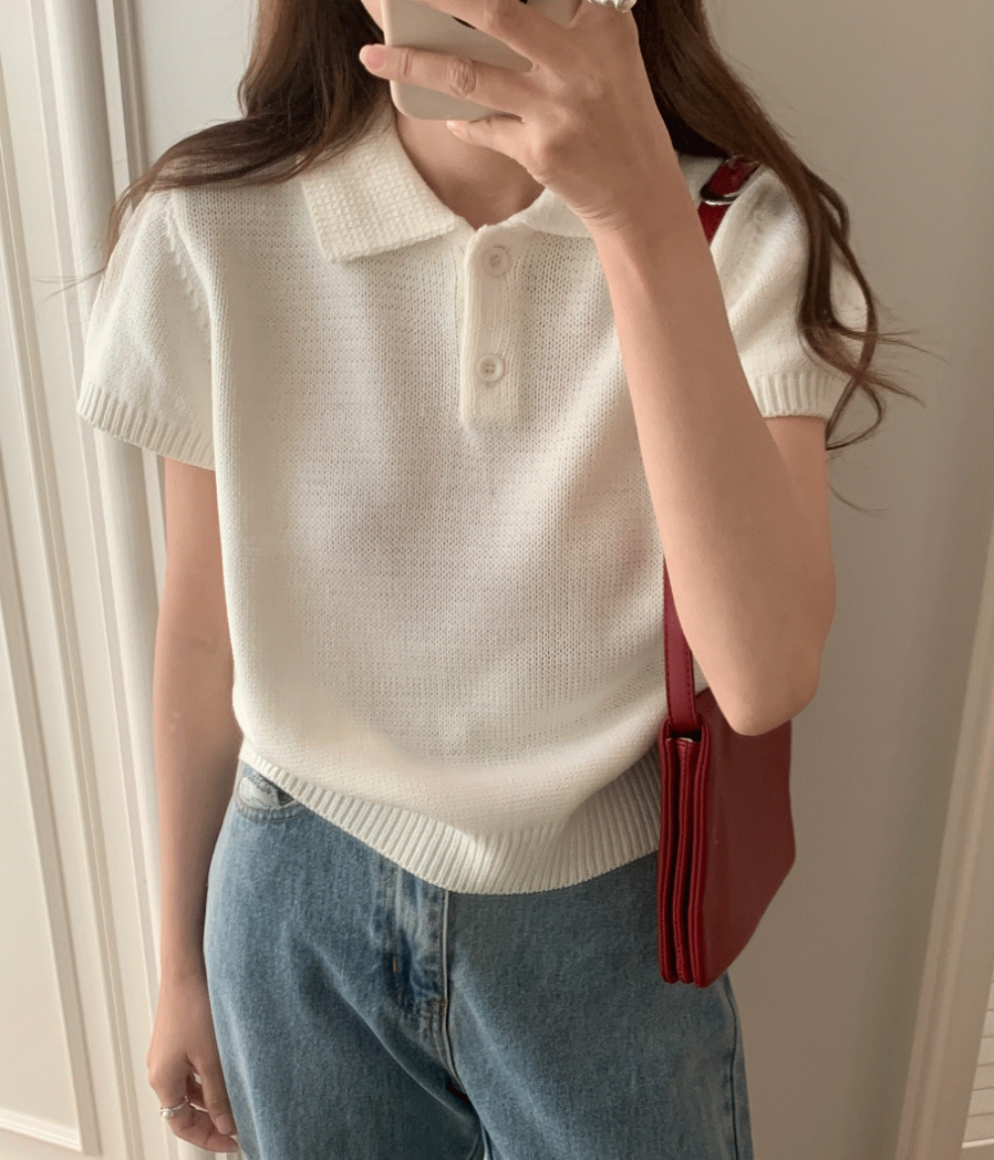 데에스 ❤️깔끔 버튼 카라 반팔 크롭 니트 4color