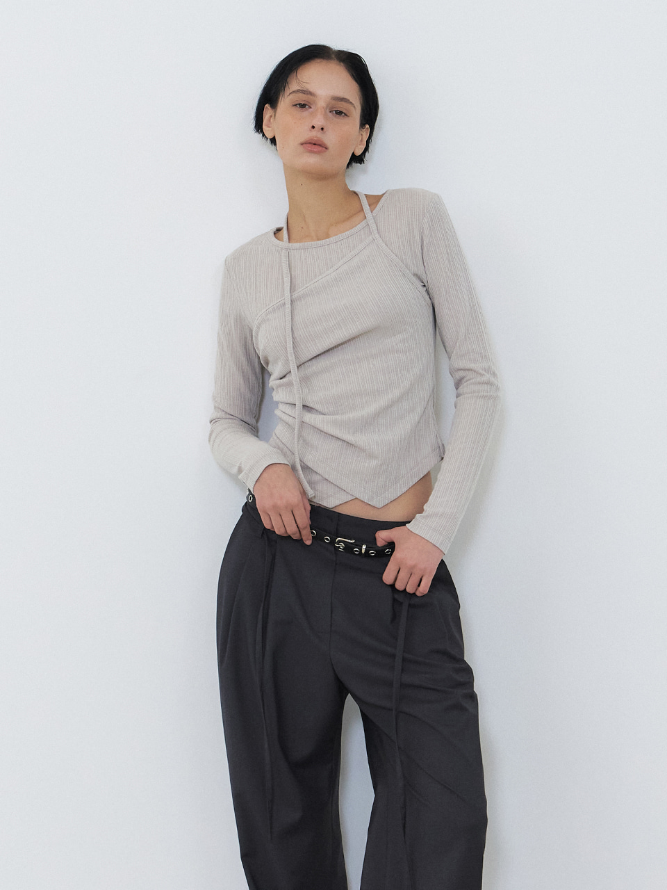 Layered Halter Strap T-Shirt, Ash Beige