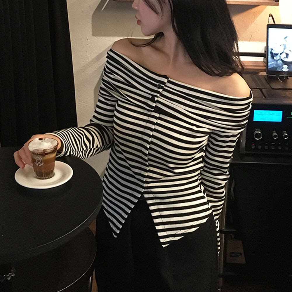 [문의폭주/존예핏/여리핏/🖤] 단가라 오프숄더 니트 긴팔 티셔츠 베르그 골지 오프숄더 단추 니트 데일리룩 데이트룩 나들이룩 여친룩
