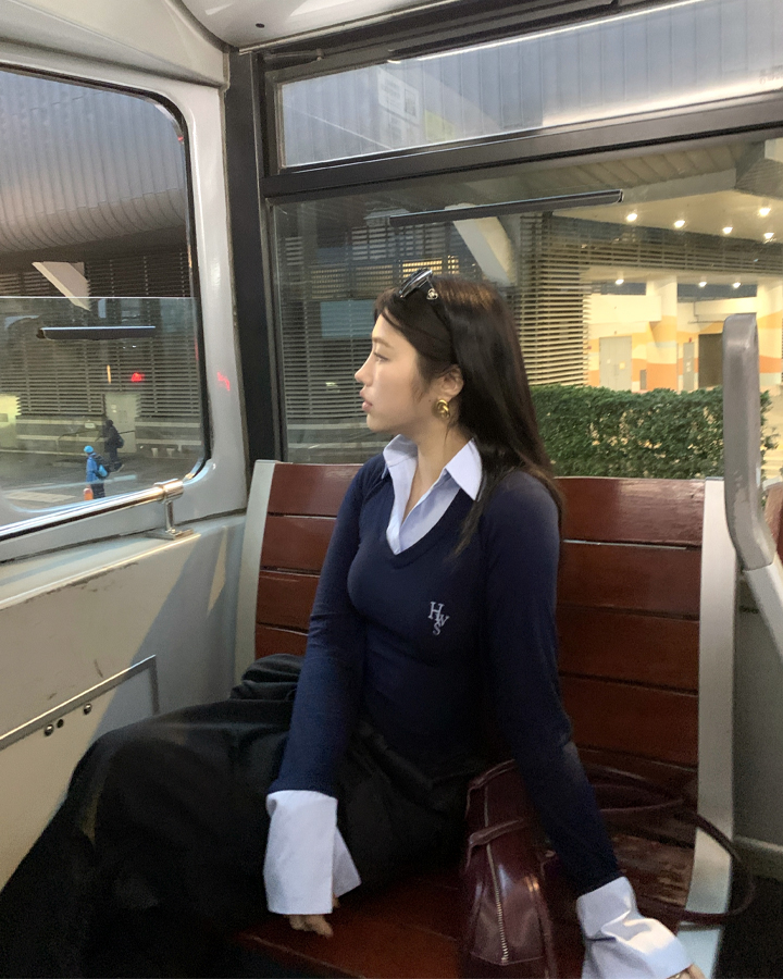 [HWS] 여성 가을 레이어드 셔츠 브이넥 자수 니트