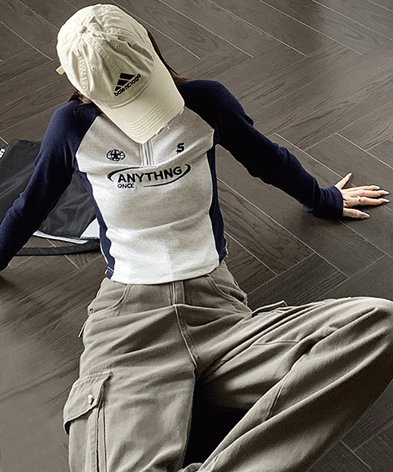 [살안타템🌤️] [스포티/y2k/블록코어🎱] 리플리 배색 레터링 자수 반집업 크롭 긴팔티