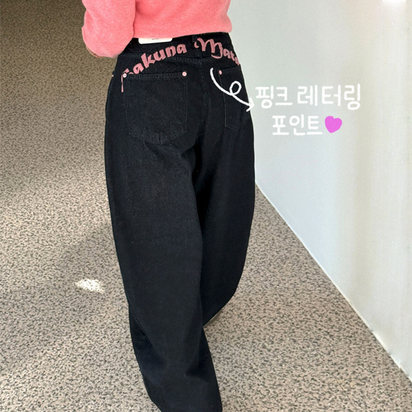 [색감깡패💖/모델소장] 핑크 레터링 포인트 벌룬 와이드 생지 데님 팬츠
