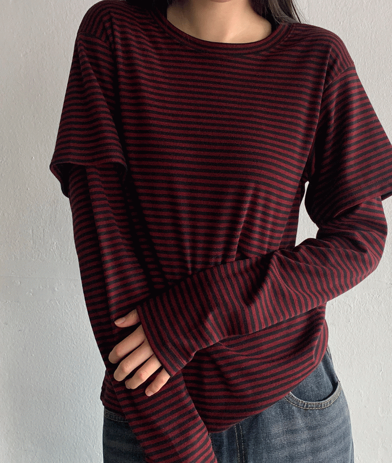 단델 스트라이프 반팔 레이어드 티셔츠 (일체형)