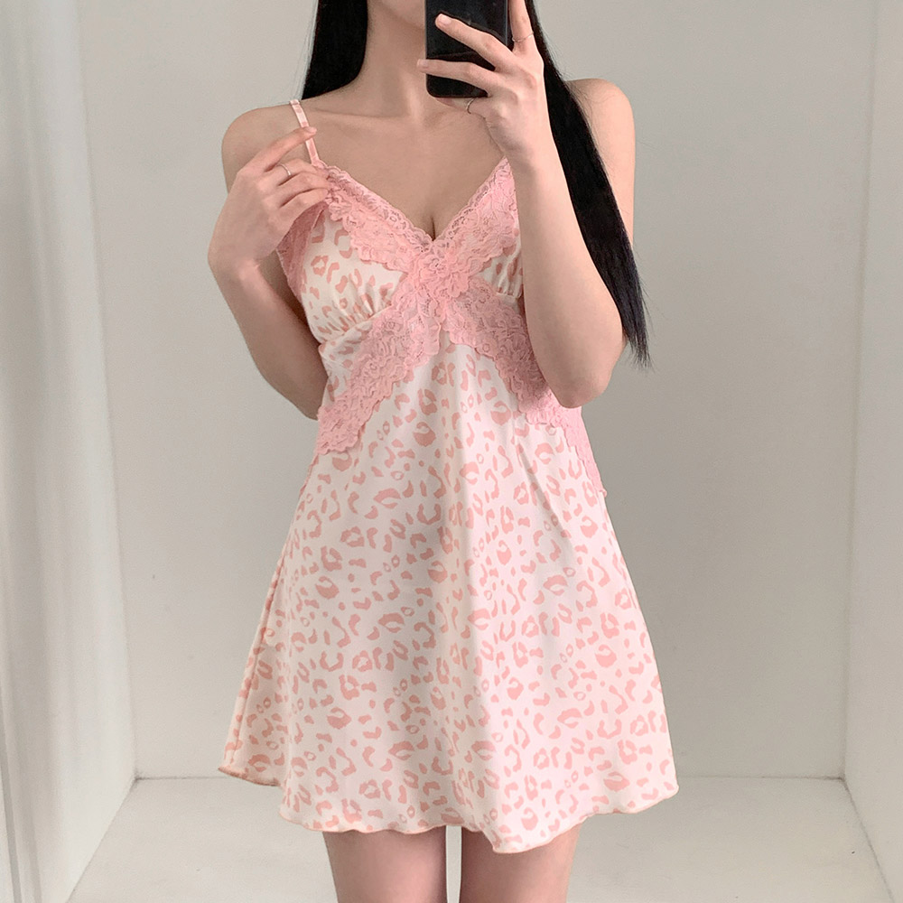 [캡내장] 어스미 핑크 호피 레이스 레오파드 끈 미니 원피스 파자마 홈웨어 잠옷