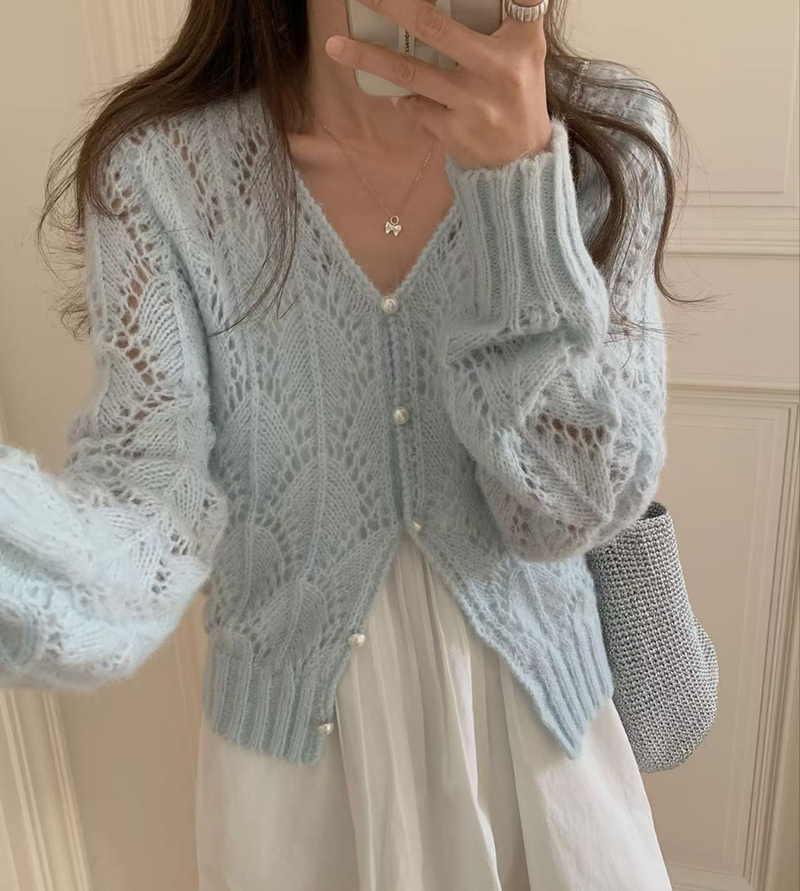 스카시 펀칭 진주버튼 여리핏 니트 가디건