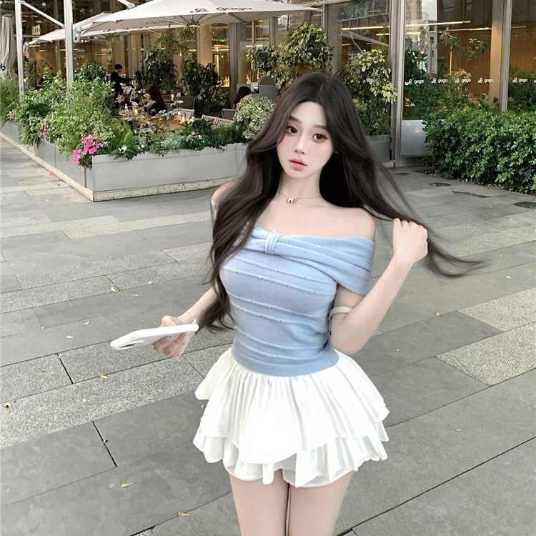 (당일출고) 슬림핏 골지 타월 오프숄더 리본 크롭 니트 티셔츠 스웨터 연말룩 하객룩 데이트룩 2color