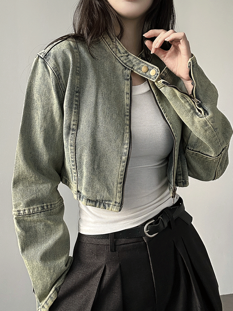 당일출고🚀[가을🍂] 헨리넥 빈티지 워싱 지퍼 숏 데님 자켓 2color