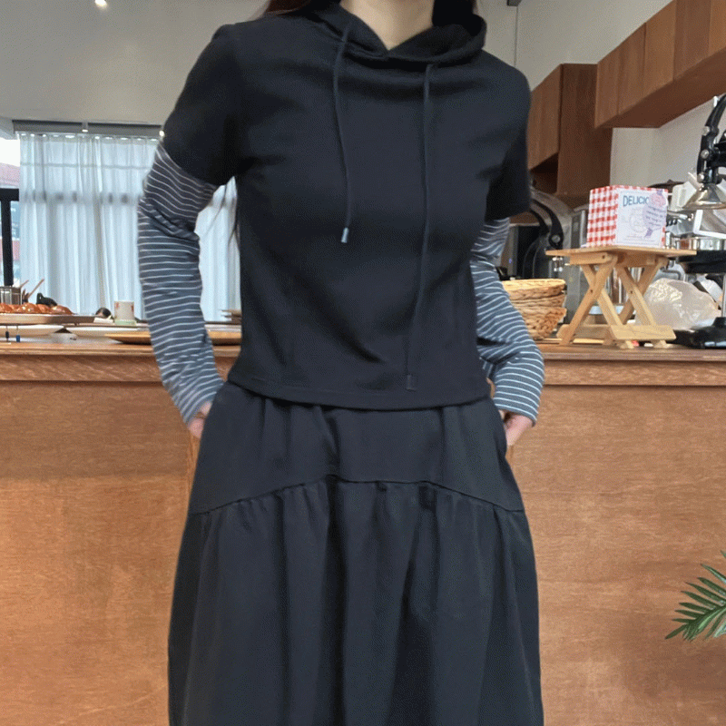 후드 이중 레이어드 단가라 슬림 긴팔 티셔츠