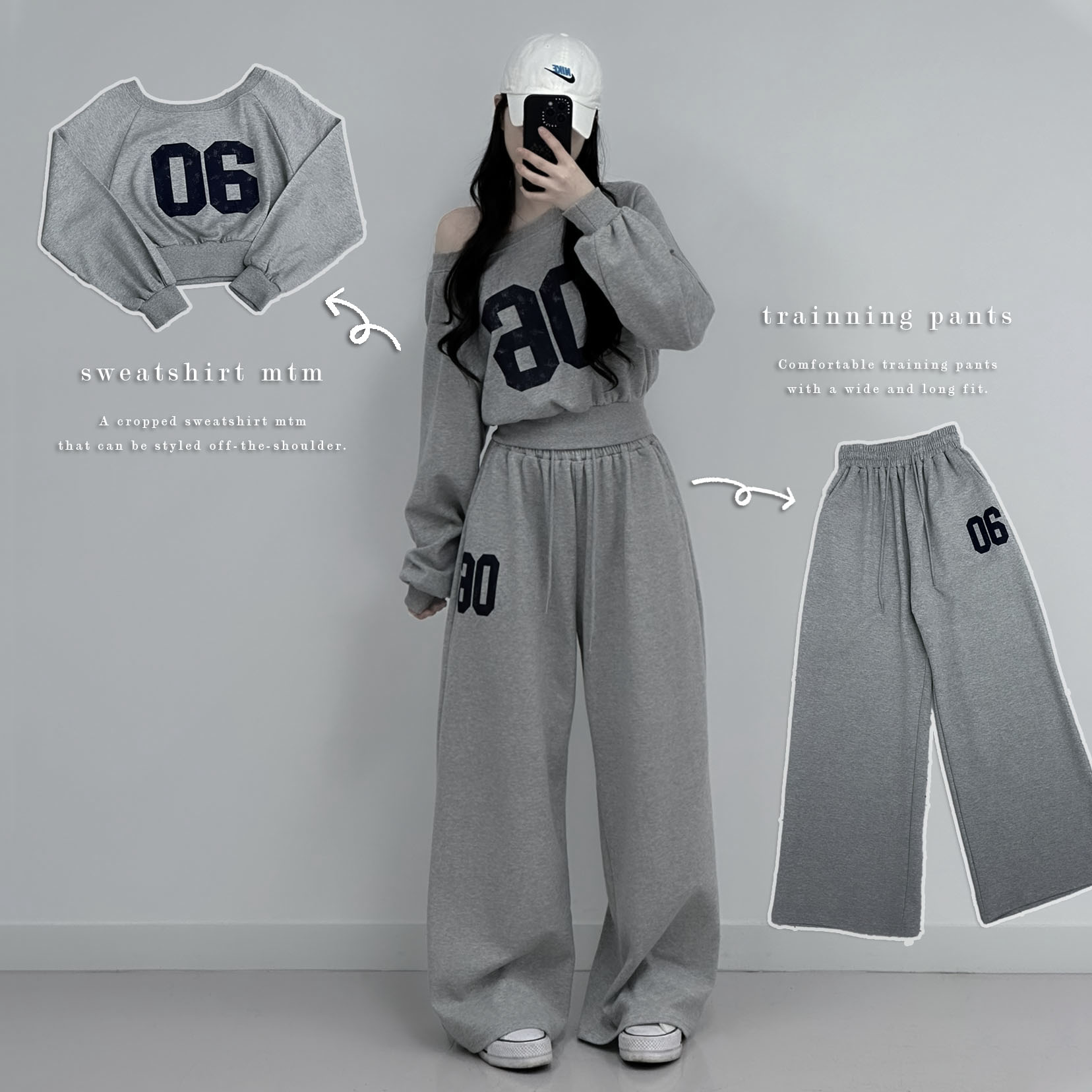 기모 ✨SET가격! [오프숄더 맨투맨 + 와이드 트레이닝 팬츠 투피스] 넘버 프린팅 포인트 입술넥 크롭 티 롱 추리닝 츄리닝 그레이 네이비 블랙 세트 셋업 (3 col)