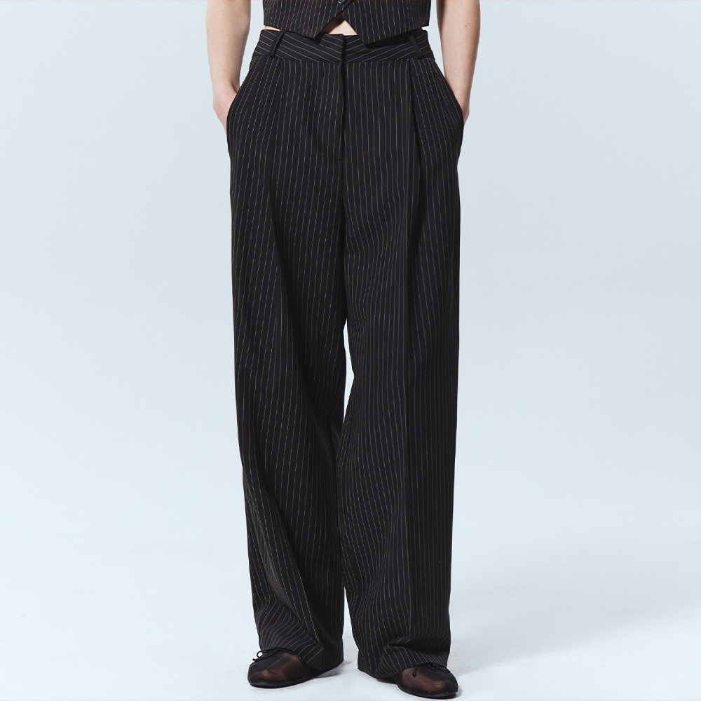 TAILORED STRIPE PINTUCK SLACKS_BLACK
