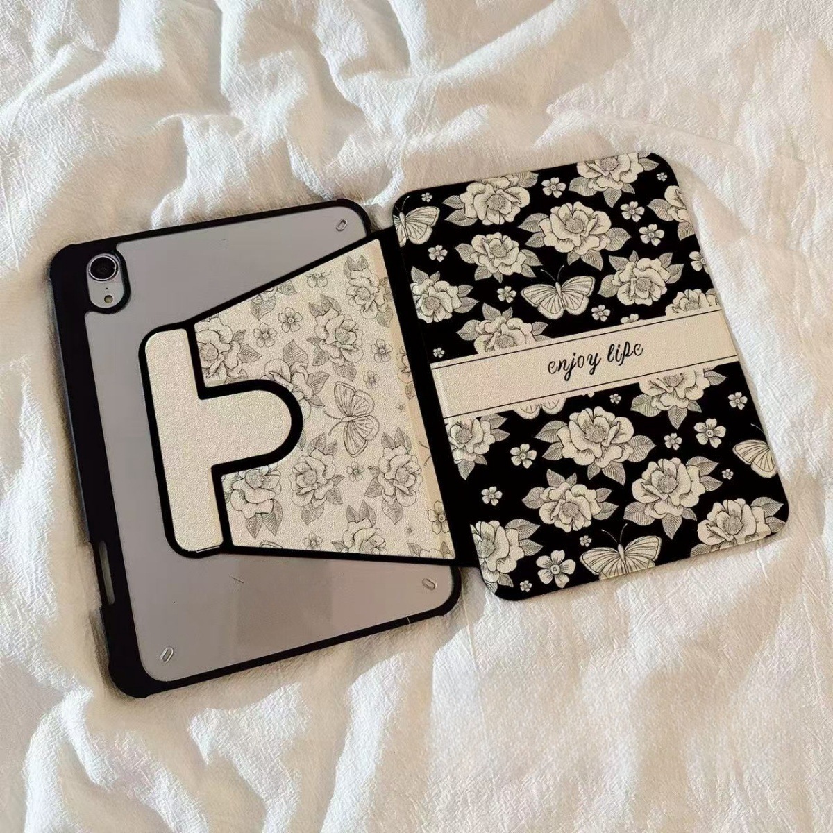 [주문제작] 빈티지 플라워 나비 블랙 레더 아이패드케이스 거치식 투명 아크릴