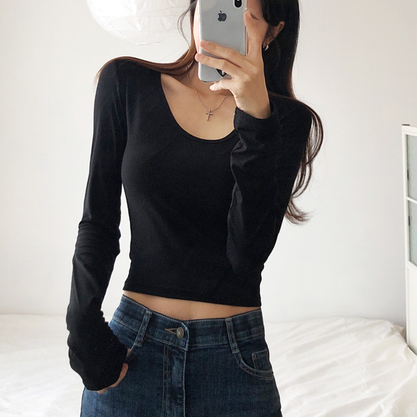 오스트리 베이직 유넥 슬림핏 크롭 긴팔 티셔츠