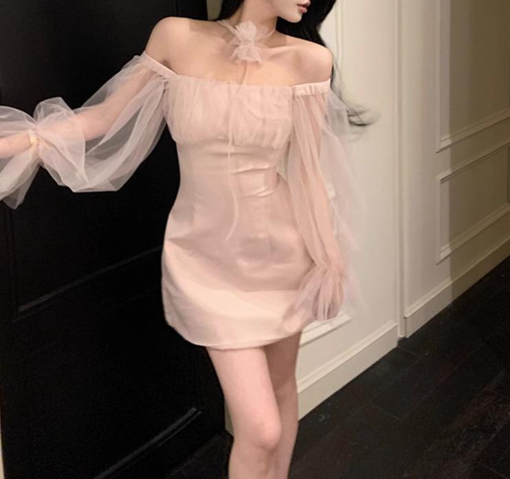 (2color)입체 꽃 초커 넥 이벤트 기념일 웨딩 브라이덜 생일 파티 쉬폰 오프 숄더 원피스