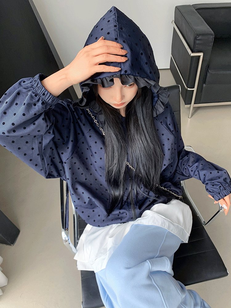 웰린 도트 프릴 바람막이 후드 점퍼