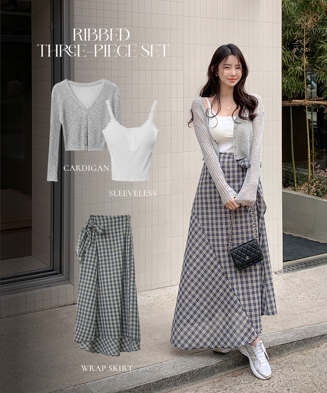 (가디건+나시+스커트 세트) 므엔 골지 크롭 가디건 + 캡나시 + 체크 랩 스커트 쓰리피스 세트