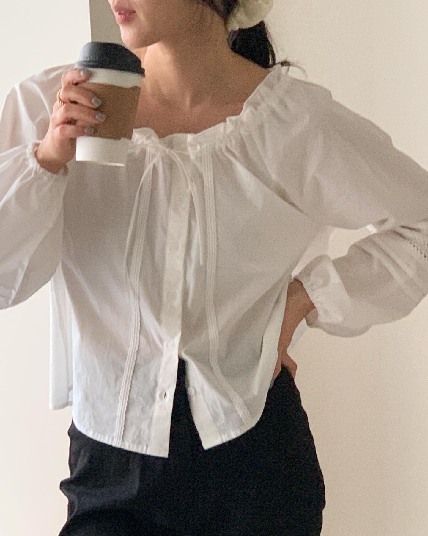 [💛봄블라우스] 런던레이스 키치 레이스 스트링 핀턱 프릴 끈 블라우스 1color
